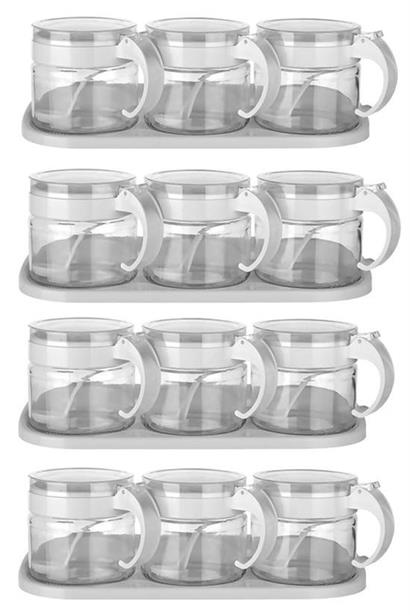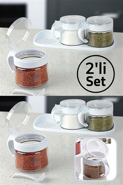 BUFFER®  Beyaz 3lü Standlı Kapaklı Kaşıklı Cam Hava Sızdırmaz Baharatlık Takımı KC-386